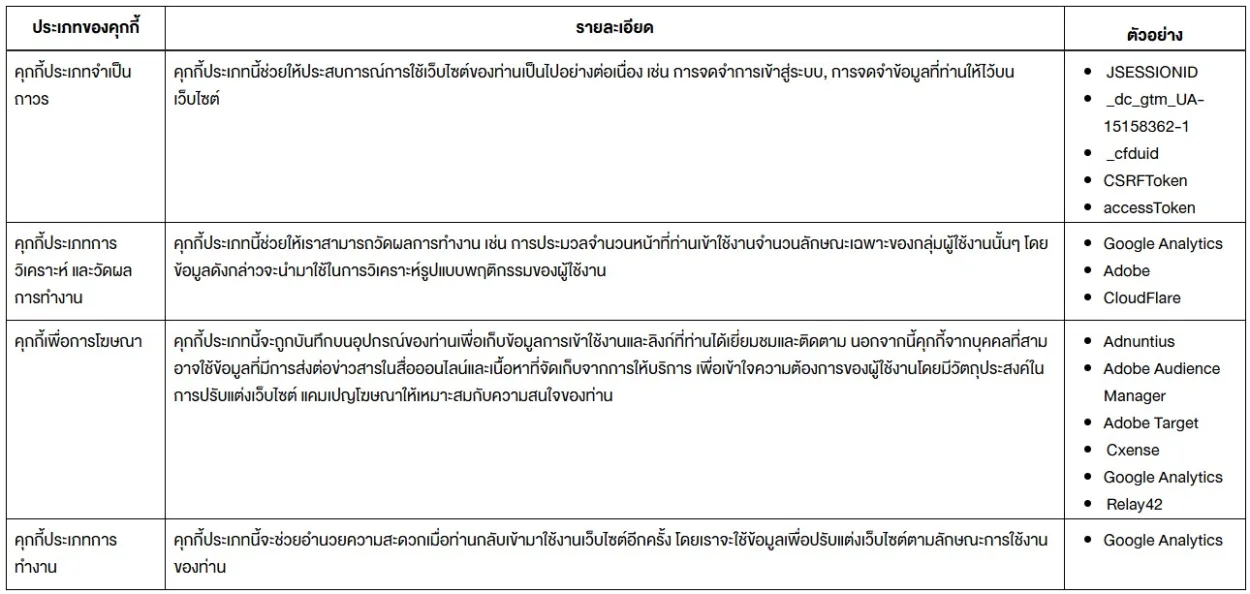 การใช้คุกกี้ (Cookies) เพื่อรวบรวมข้อมูลในขณะที่ท่านใช้งานเว็บไซต์หรือแอปพลิเคชั่น โดยช่วยให้บริษัทสามารถจัดให้มีการบริการที่ดีขึ้น เร็วขึ้น ปลอดภัยขึ้น และเพื่อความเป็นส่วนตัวของท่าน เมื่อท่านใช้บริการ และ/หรือเข้าสู่แพลตฟอร์ม cookies คือ text files ที่อยู่ในคอมพิวเตอร์ของท่านที่ใช้เพื่อจัดเก็บรายละเอียดข้อมูล log การใช้งานอินเทอร์เน็ตของท่านหรือพฤติกรรมการเยี่ยมชมเว็บไซต์ของท่าน